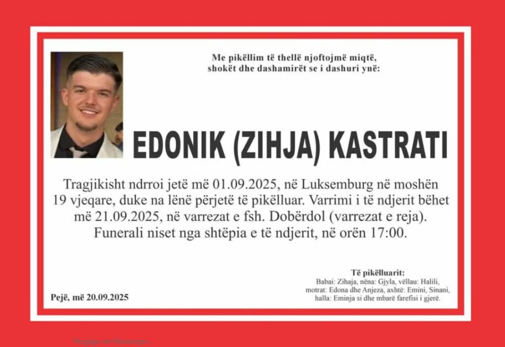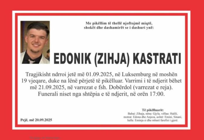 Edonik Kastrati, 19-vjeçari që mbeti i vdekur si pasojë e një aksidenti tragjik në Luksemburg më 1 shtator të këtij viti, do të varroset të hënën (21 shtator) në varrezat e fshatit Dobërdol.