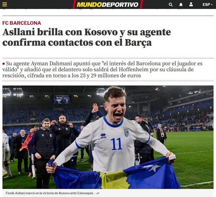 Agjenti i Fisnik Asllanit, Ayman Dahmani, tregoi se “interesi i Barcelonës për lojtarin është i vlefshëm” dhe shtoi se sulmuesi do të largohet nga Hoffenheim vetëm nëse aktivizohet klauzola e tij e lirimit, e vlerësuar në rreth 25 deri në 29 milionë euro.
