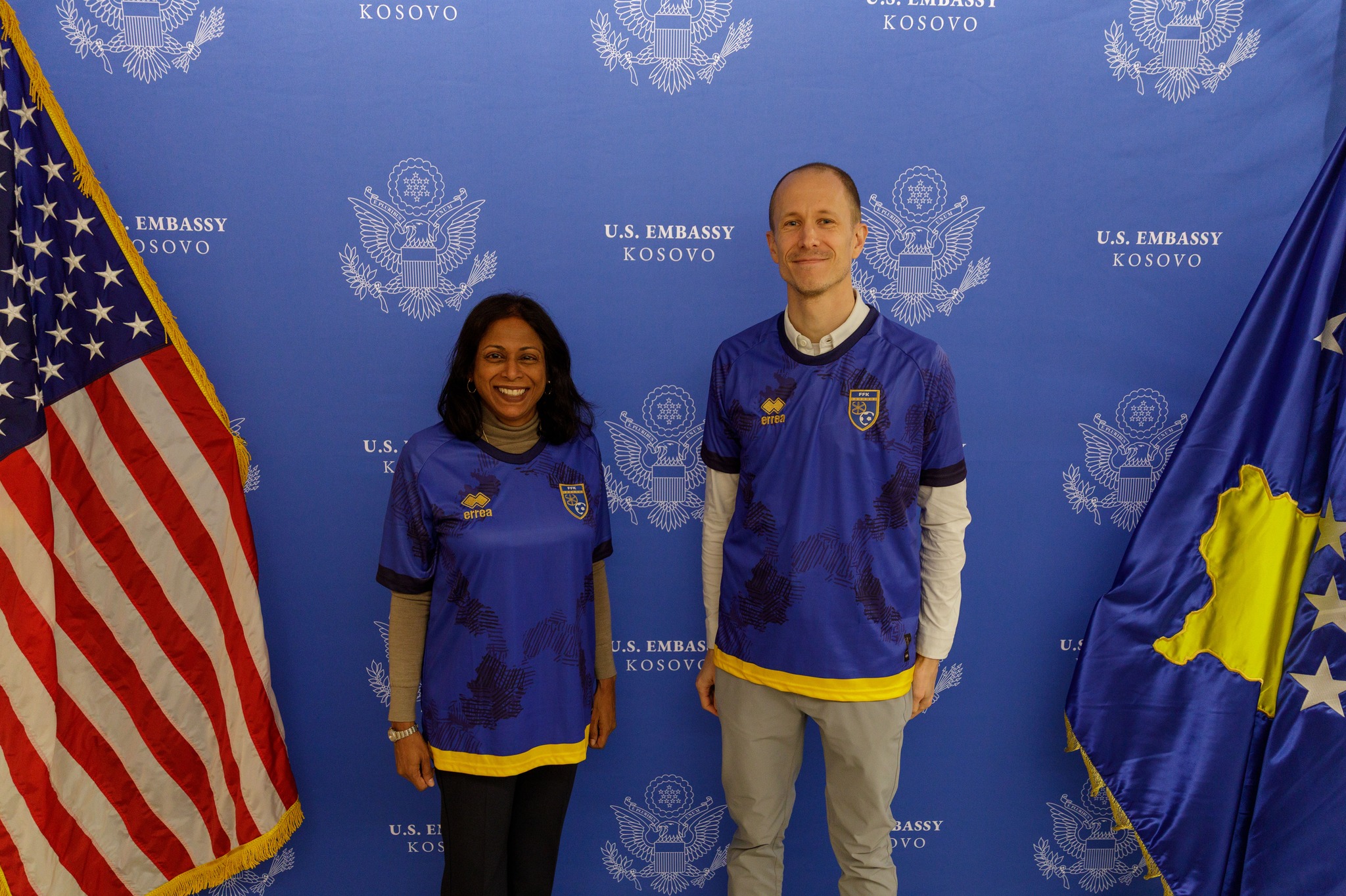 Në njërën prej fotografive shihet E Ngarkuara me Punë e Ambasadës në Prishtinë, Anu Prattipati, e veshur me fanellën e kombëtares së Kosovës në futboll.
