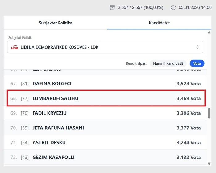 Sipas rezultateve të deritanishme, ish-futbollisti nga Vitia ka marrë gjithsej 3,469 vota, duke u renditur i 68-ti në listën e LDK-së për nga numri i votave. Ky rezultat e lë atë larg pragut të nevojshëm për të fituar një mandat deputeti.