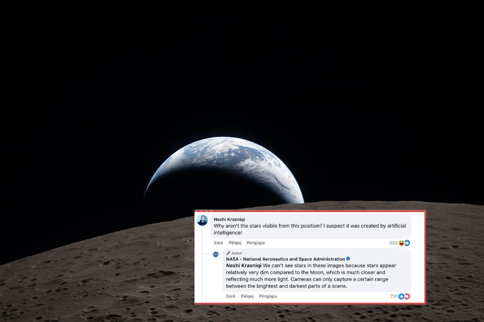 NASA i është përgjigjur duke sqaruar arsyen shkencore: “Nexhi Krasniqi, nuk mund të shohim yje në këto imazhe sepse yjet duken relativisht shumë të zbehtë krahasuar me Hënën, e cila është shumë më afër dhe pasqyron shumë më shumë dritë. Kamerat mund të kapin vetëm një gamë të caktuar midis pjesëve më të ndritshme dhe më të errëta të skenës”, ka thënë NASA.