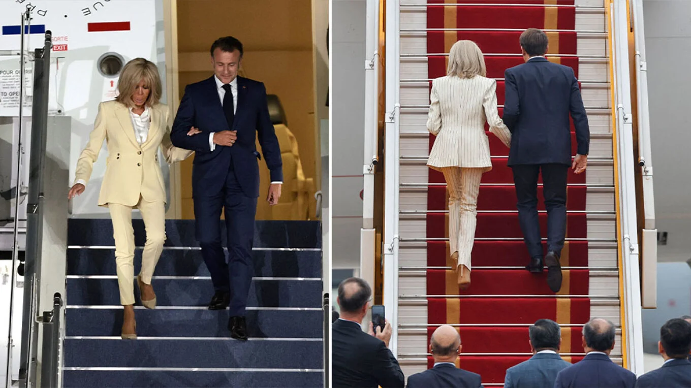 Emmanuel dhe Brigitte Macron i ngjitën së bashku shkallët e avionit presidencial, duke qëndruar pranë njëri-tjetrit dhe duke buzëqeshur. Me të mbërritur në Xhakarta të Indonezisë, ata zbritën shkallët duke u kapur fort me njëri-tjetrin.