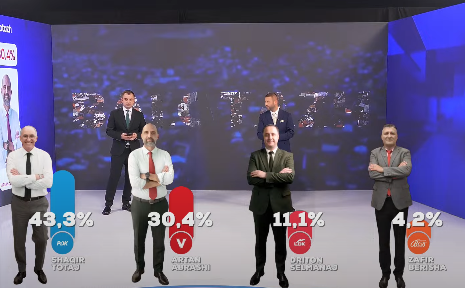 Shaqir Totaj i PDK-së me 43.3%, Artan Abrashi i VV-së me 30.4% dhe LDK me Driton Selmanajn 11.1%.