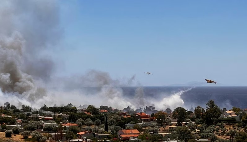 Në një nga ditët më të nxehta të këtij qershori, Greqia po përballet me një situatë alarmante zjarresh në afërsi të qytetit bregdetar Palaia Fokaia, rreth 40 kilometra në jug të Athinës.