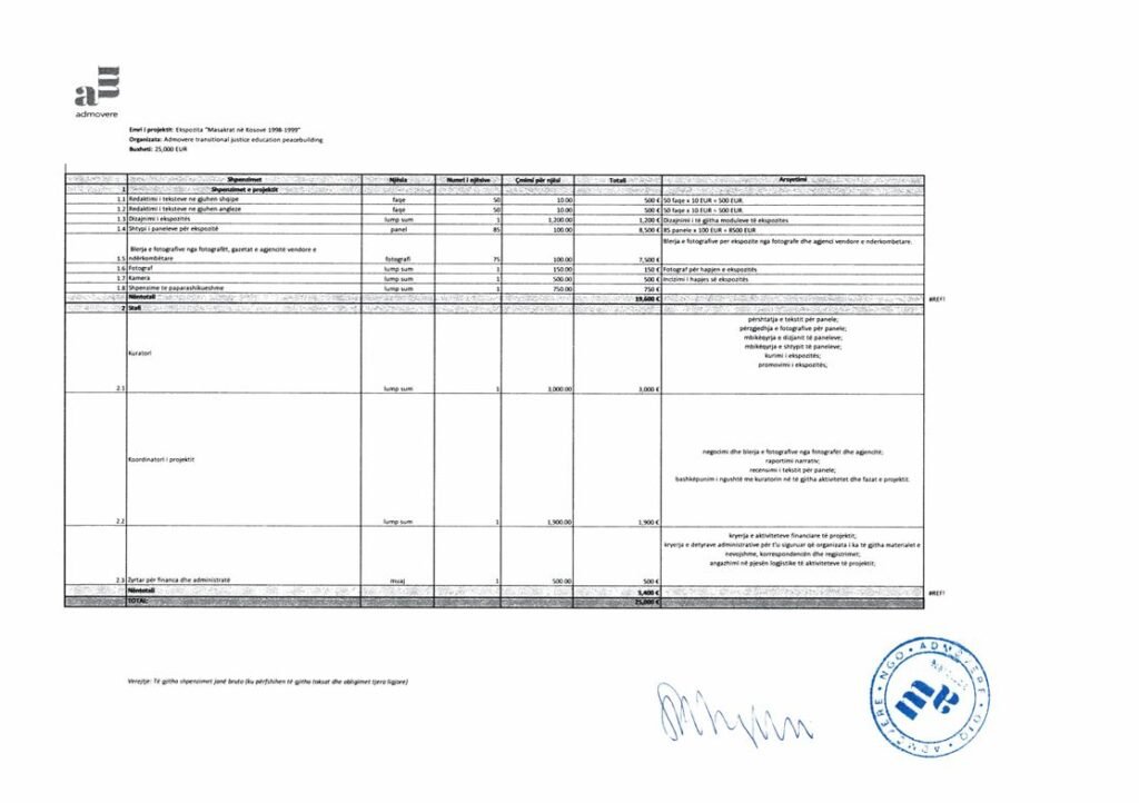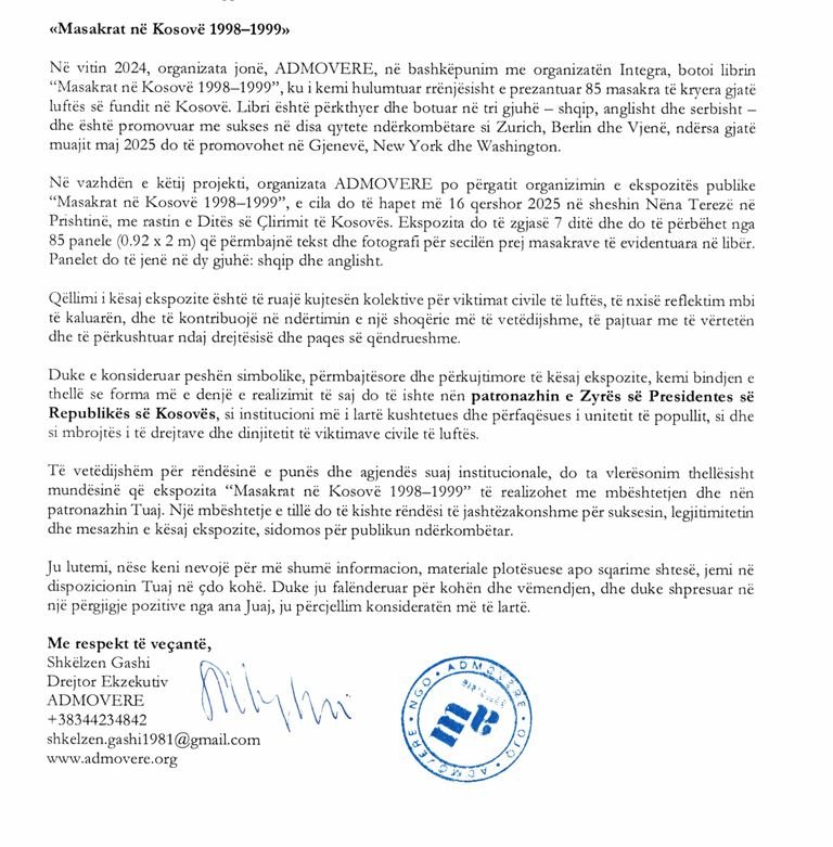 Sipas dokumentit e hartuar nga Gashi, ekspozita për masakrat ishte planifikuar të hapej më 16 qershor 2025 në sheshin kryesor të Prishtinës, në rastin e Ditës së Çlirimit të Kosovës.