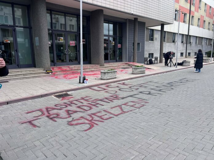 Protestuesit kanë hedhur ngjyrë të kuqe para hyrjes së Kuvenditt ë Kosovës, si dhe kanë shkruajtur me sprej kanë shkruar “Jashtë tradhtarët, poshtë tradhtarët”.