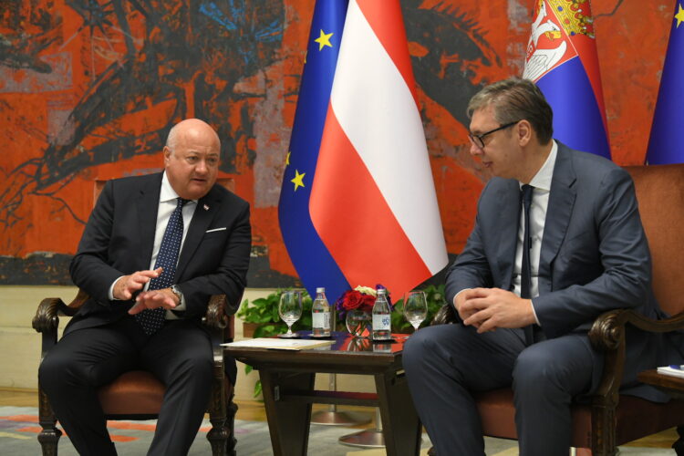Brenda, në sallën e shtypit, presidenti serb, Aleksandar Vuçiq dhe kancelari austriak, Christian Stocker, si pjesë e vizitës së tij të parë në Beograd, filluan takimin e zakonshëm diplomatik, shkruan gazeta austriake KleineZeitung.
