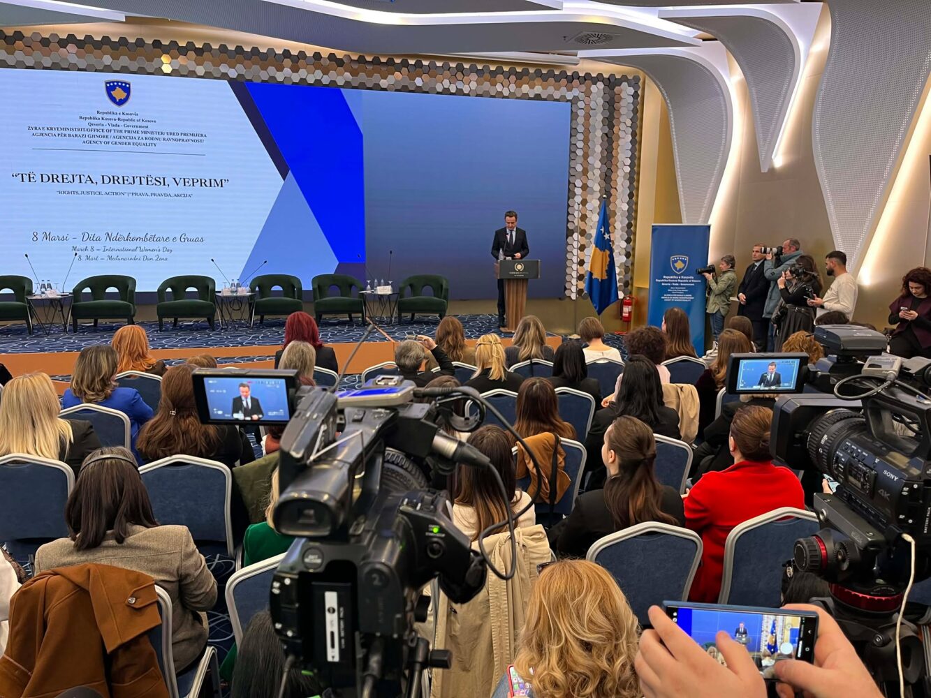 “Në ditën ndërkombëtare të gruas flasim për drejtësi të barabartë, jo si një parim abstrakt, por si një përgjegjësi e Republikës së Kosovës. Drejtësia e barabartë në Kosovë do të thotë që të drejtat e garantuara nga kushtetuta dhe ligji të zbatohen plotësisht në çdo gjykatë, në çdo vend pune, në çdo komunë dhe në çdo stacion policie. Do të thotë që dhuna në familje dhe diskriminimi nuk tolerohen, justifikohen ose fshihen, por ndiqen penalisht dhe parandalohen. Do të thotë që çdo vajzë dhe grua në Kosovë ka qasje të barabartë në arsim dhe mundësi cilësore për jetë dhe karrierë. Drejtësia e barabartë do të thotë që gratë nuk janë vetëm votuese, por edhe vendimmarrëse. Do të thotë përfaqësim i barabartë në politikë, lidership, në institucione publike dhe pjesëmarrje kuptimplote në formësimin e së ardhmes së vendit tonë. Sepse një demokraci nuk mund të jetë e fortë nëse gjysma e popullsisë së saj është e nënpërfaqësuar”, tha ai në shënimin e Ditës Ndërkombëtare të Gruas – 8 Marsi, me temën globale të këtij viti: “Të Drejta, Drejtësi, Veprim”, organizuar nga Agjencia për Barazi Gjinore, në kuadër të Zyrës së Kryeministrit të Republikës së Kosovës.