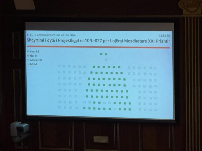 Projektligji për Lojërat Mesdhetare XXI Prishtina 2030 kaloi në shqyrtimin e dytë me 64 vota për, asnjë kundër dhe asnjë abstenim, duke marrë mbështetje të plotë nga të pranishmit në sallë.