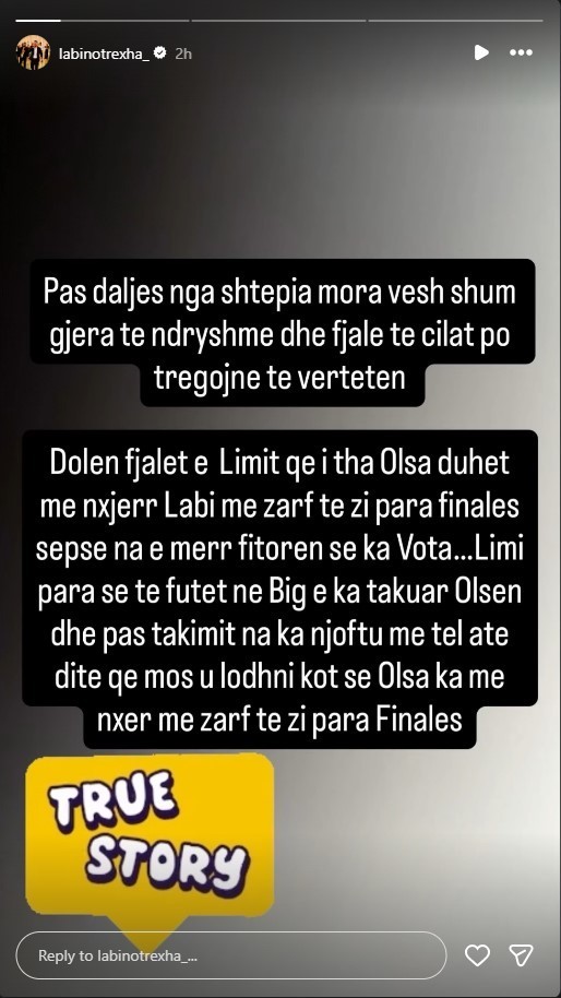 Dolen fjalët e Limit që i tha Olsa: duhet me nxjerr Labi me zarf të zi para finales sepse na e merr fitoren se ka vota… Limi, para se të futet në Big, e ka takuar Olsen dhe pas takimit na ka njoftuar me telefon atë ditë që mos u lodhni kot, se Olsa ka me nxjerr me zarf të zi para finales”.