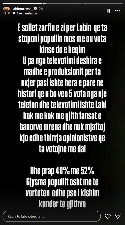 “E sollët zarfin e zi për Labin që ta stoponi popullin, mos me çu vota kinse do e heqim. U pa nga televotimi dëshira e madhe e produksionit për ta nxjerrë, pasi ishte hera e parë në histori që u bënë vetëm 5 vota nga një telefon dhe televotimi ishte Labi kokë më kokë me gjithë fansat e banorëve mrena dhe nuk mjaftoi kjo, edhe thirrja e opinionistëve që ta votojnë me dalë.