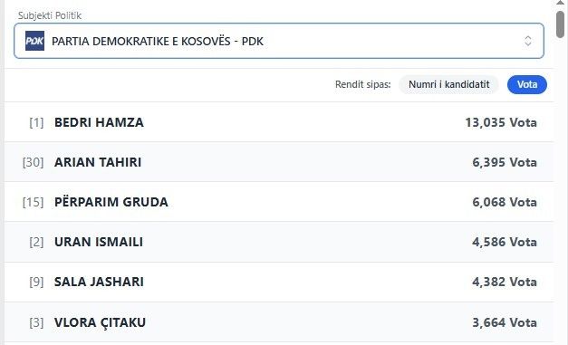 Kur janë numëruar mbi 8 për qind e votave, në listën e PDK-së befason Arian Tahiri i cili po radhitet i dyti pas Bedri Hamzës, me plot 6235 vota, derisa i pari i PDK-së ka 12,584 vota.