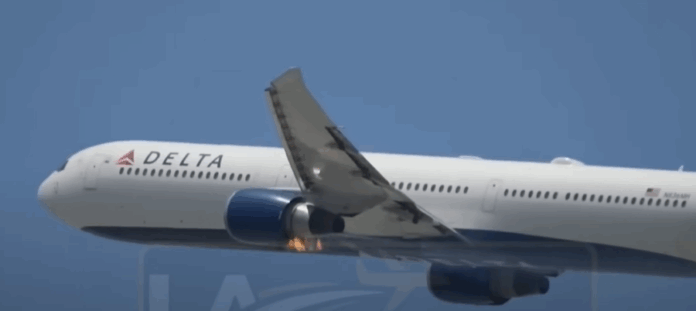 Video tregon avionin Boeing 767-400 gjatë ngritjes së tij mbi Los Anxhelos, teksa motori i majtë përfshihet nga flakët. Aeroplani, i cili po shkonte për në Atlanta, më pas bëri një rrotullim dhe u ul në mënyrë të sigurt në pistë.