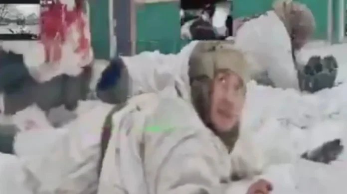 Tre trupa ruse të veshur me veshje të bardha ushtarake mund të shihen të shtrirë në borë, përpara se të ngrihen me kujdes dhe të ecin drejt robotit luftarak.