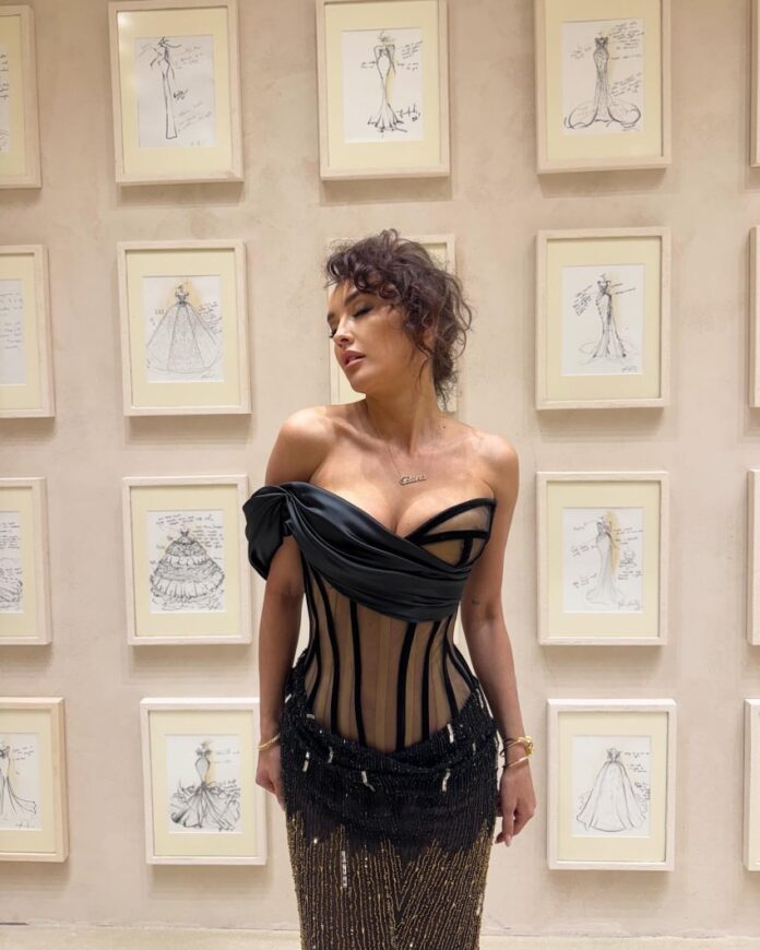 Për këtë rast të veçantë, Elena kishte zgjedhur një fustan të zi të dizajnuar nga stilisti i njohur shqiptar Valdrin Sahiti, i cili njihet për krijimet e tij luksoze dhe të sofistikuara.