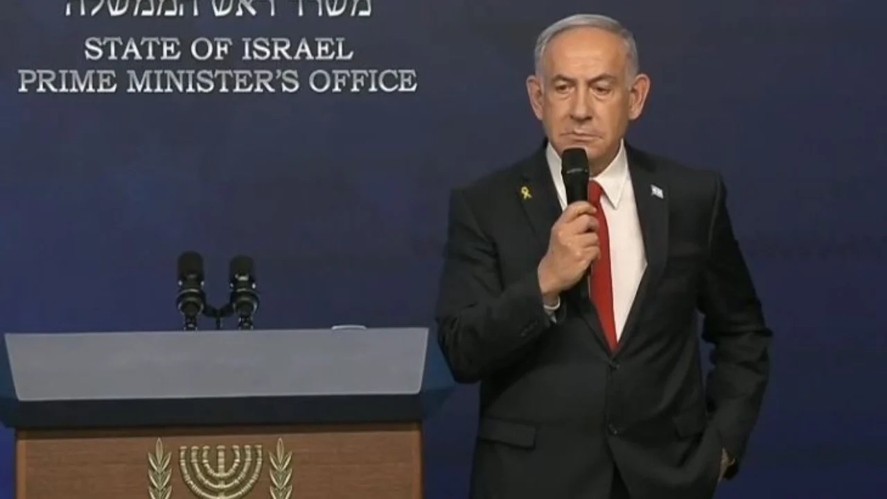 Kryeministri izraelit Benjamin Netanyahu po mban një konferencë për shtyp.