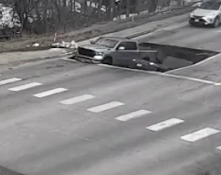 Në video shihen dy vetura që ndalojnë në semafor të kuq, kur papritur asfalti shembet poshtë tyre dhe të dyja bien në gropë.