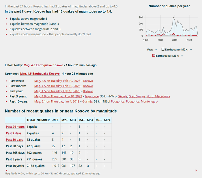 Të dhënat statistikore tregojnë se gjatë 12 muajve të fundit në Kosovë dhe zonat përreth janë regjistruar mbi 300 tërmete të magnitudave të ndryshme, shumica prej tyre me intensitet të ulët.