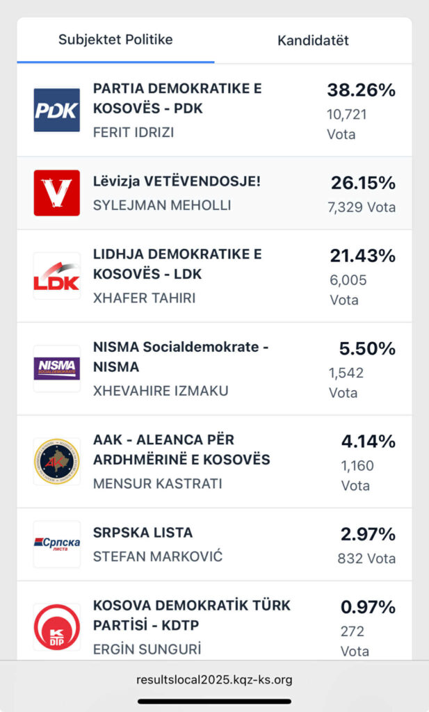 Pas PDK-së, në vendin e dytë renditet Lëvizja Vetëvendosje, me 26.15% të votave (7,329 vota), e ndjekur nga Lidhja Demokratike e Kosovës (LDK) me 21.43% apo 6,005 vota.
