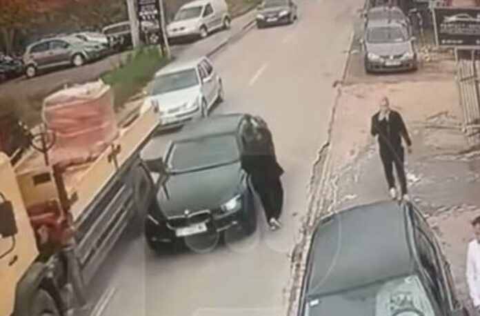 Në pamjet e publikuara në rrjete sociale, shihet se si qytetari arrin të largohet në momentin e fundit para se vetura t’i afrohej.