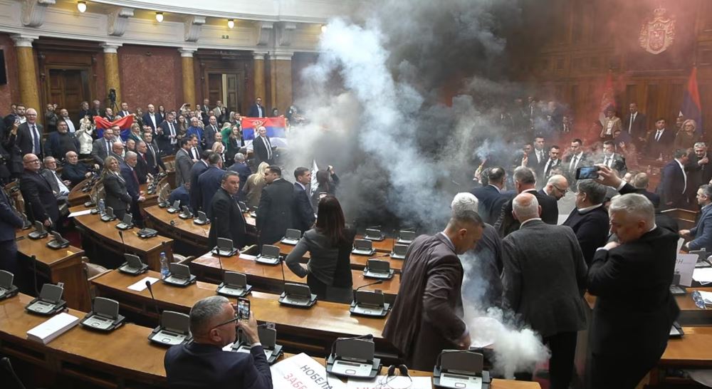 Atëherë, deputetët e opozitës janë larguar prej vendeve të tyre dhe kanë aktivizuar mjetet piroteknike.