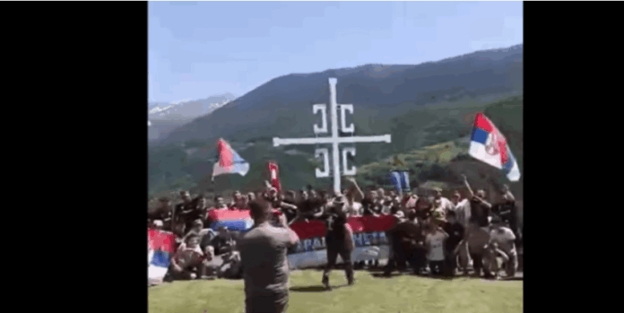 Në pamje shfaqen një grup i tës rinjve serbë të mbledhur në një fushë të hapur, duke mbajtur flamuj të Serbisë dhe pankarta me mesazhe nacionaliste dhe banderola me mbishkrimin “Çeta e guximshme”.