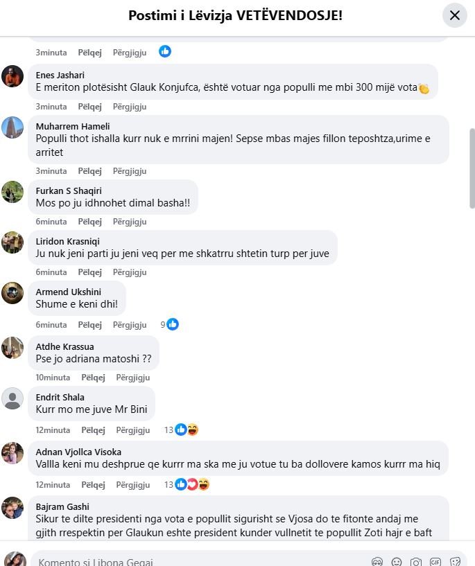 Pas publikimit të këtij njoftimi komentet në faqen e Vetëvendosjes janë disproporcionalisht në mbështetje të Vjosa Osmanit, dhe në kundërshtim të Glauk Konjufcës.