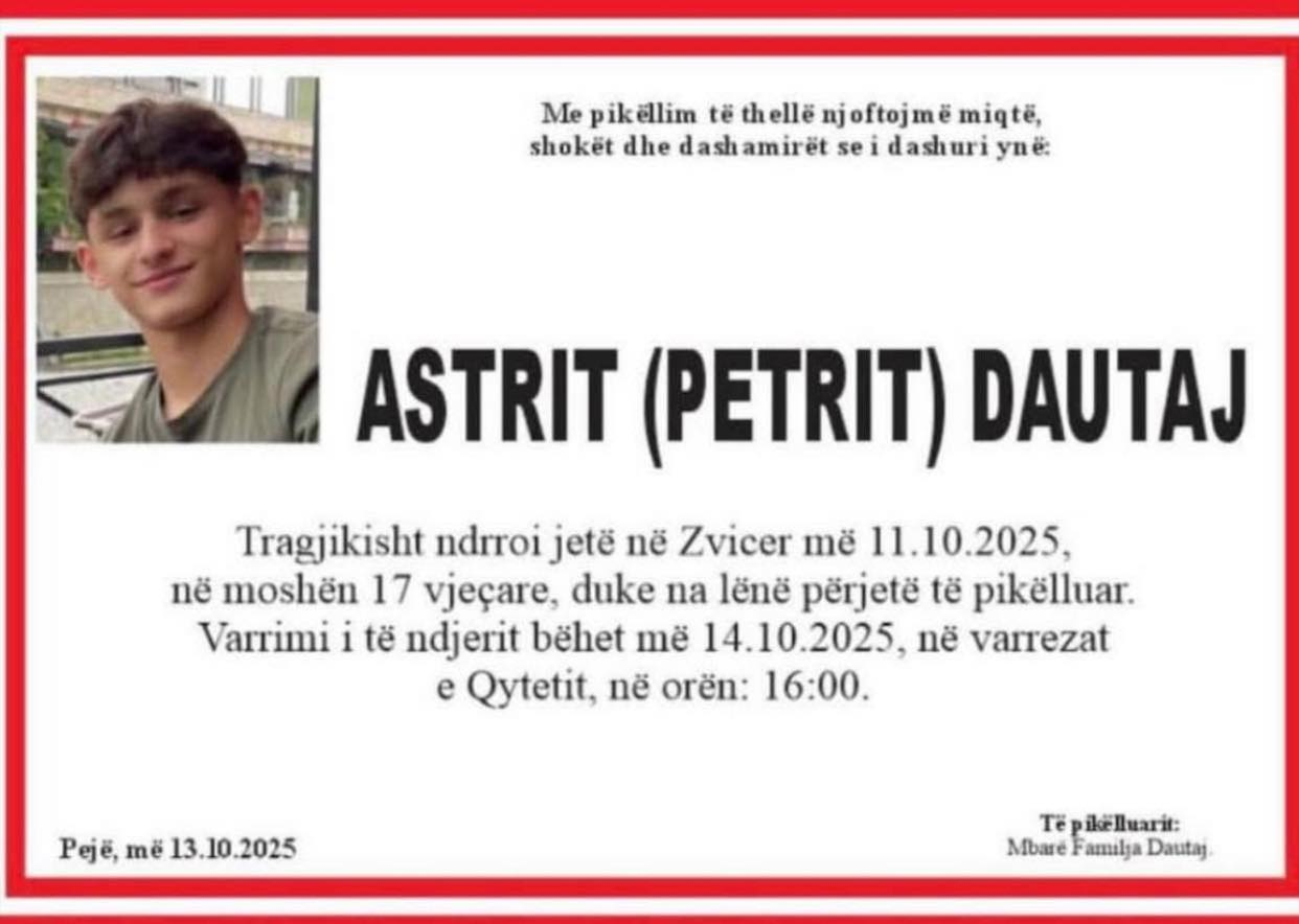 Një ngjarje e rëndë ka tronditur komunitetin shqiptar në Zvicër dhe më gjerë. Më 11 tetor 2025, ka ndërruar jetë tragjikisht i riu Astrit Dautaj, në moshën vetëm 17-vjeçare.